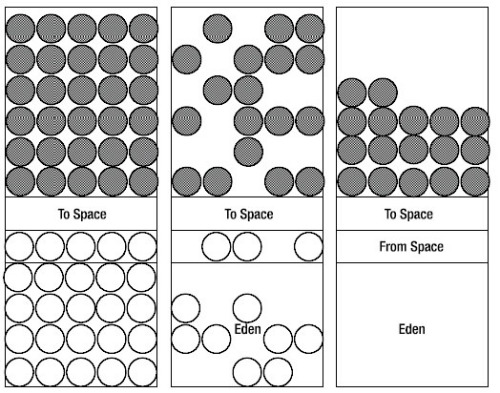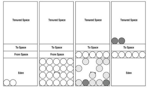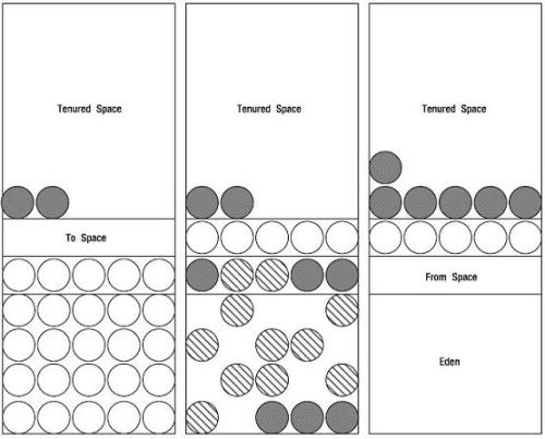 对象在eden出生就是被创建,当eden满了的时候,垃圾收集器就把所有在eden中的对象扫描一次,把所有有效的对象拷贝到第一个幸存者空间,同时把无效的对象所占用的空间释放。当eden再次变满了的时候,就启动移动程序把eden中有效的对象拷贝到第二个幸存者空间,同时,也将第一个幸存者空间中的有效对象拷贝到第二个幸存者空间。如果填充到第二个生存者空间中的有效对象被第一个生存者空间或eden中的对象引用,那么这些对象就是长期存在的(也就是说,他们被拷贝到老一代)。若垃圾收集器依据这种小幅度的调整收集(minor collection)不能找出足够的空间,就是象这样的拷贝收集(copy collection),就运行大幅度的收集,就是让所有的东西停止(stop-the-world collection)。运行这个大幅度的调整收集时,垃圾收集器就停止所有在堆中运行的线程并执行清除动作(mark-and-sweep collection),把新一代空间释放空并准备重启程序。