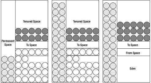 正像图7显示的,当持久空间变满了的时候,就引发垃圾收集,清理了乐园和幸存者空间,但是并不释放持久空间中的一点内存。