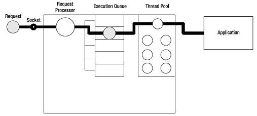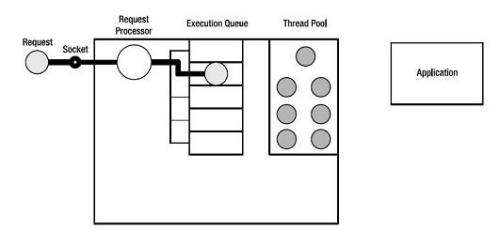 每个服务器都有一个socket负责监听。程序把接受到的请求放到待执行队列中,然后将这个请求从队列移动到线程中被程序处理。