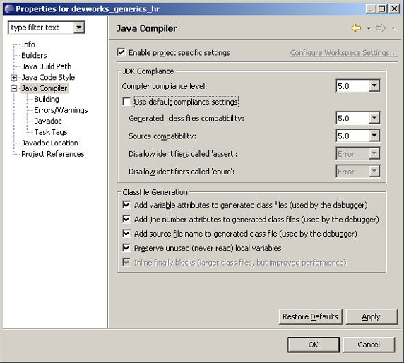 Java 5 设置使用两个特定的属性页。第一个属性页指定编译器设置。