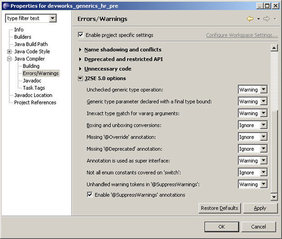 大量 J2SE 5 选项能够控制 Eclipse 为您的 Java 5 代码产生什么类型的错误和警告(请参见表 1)