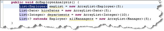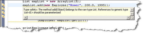 Eclipse V3.1 已经添加了快速帮助以促进 Java 5 中的泛型支持。请考虑这个普通的 for() 循环,参见清单 3 中的 printEmployees() 方法。
