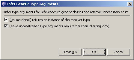 为了定位快速修复建议,移至重构菜单。Eclipse 中很多重构与 Java 5 中的泛型直接相关。“Infer Generic Type Arguments”重构将给列表增加泛型支持。 第一个对话框允许您选择选项。