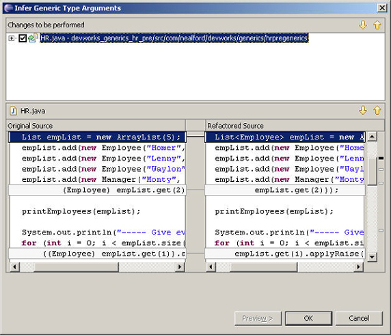 代码发生了两个有趣的变化。第一 ―― 也是最明显的 ―― List 和 ArrayList 声明现在是 Employee 类型的泛型。第二 ―― 不太明显 ―― 代码最后一行发生的变化。您观察一下 Manager 类的原来的 empList 添加,它的最后一个参数需要针对 Assistant 域强制类型转换为 Employee。而 Infer 重构足够聪明,它可以删除现在不必要的类型强制转换。