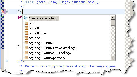 在介绍完快速修复之前,Eclipse 还在 Java 5 支持中增加了另外一个有趣的方面:您可以得到为方法添加注释的建议,比如 @Override。您还具有针对注释的内容帮助。